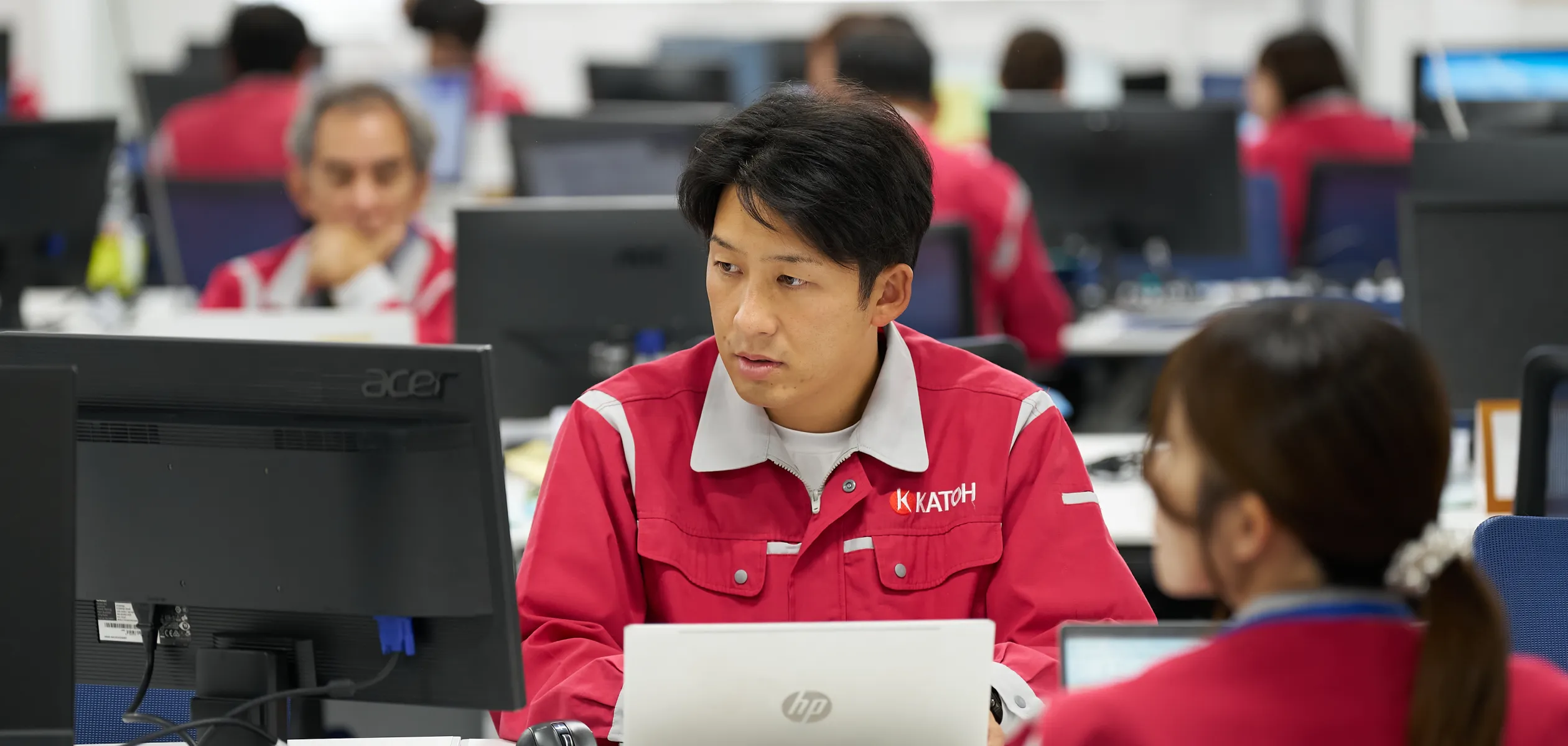 出社後、朝礼で昨日起きているトラブルや開発品状況の確認を行います。